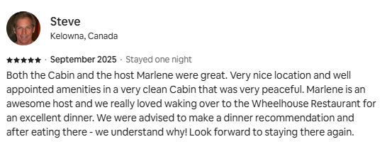 An accessible and tranquil retreat where nature and comfort meet. Thoughtfully designed with step-free entry, wide doorways, and grab bars, it’s perfect for guests with mobility needs or anyone who prefers barrier-free comfort. Enjoy coffee on your deck, explore the trail next door, or grab dinner at The Wheelhouse Restaurant before returning to a quiet, peaceful evening by the water.